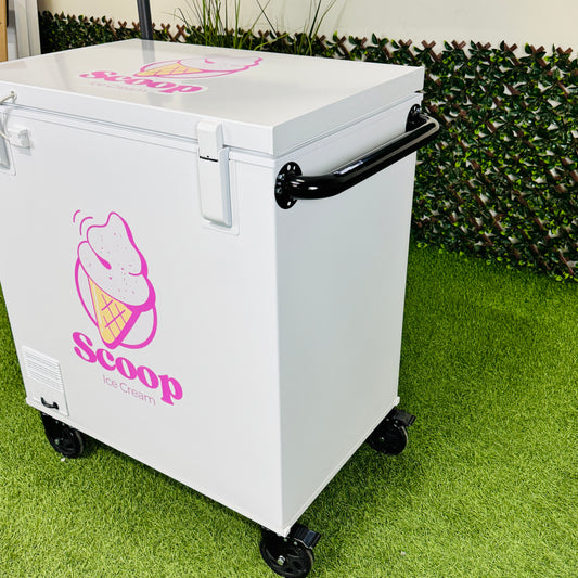 Ice Cream Cart 7cu Portable Freezer Chest with Wheels, Umbrella Holder , Side Table & Logos