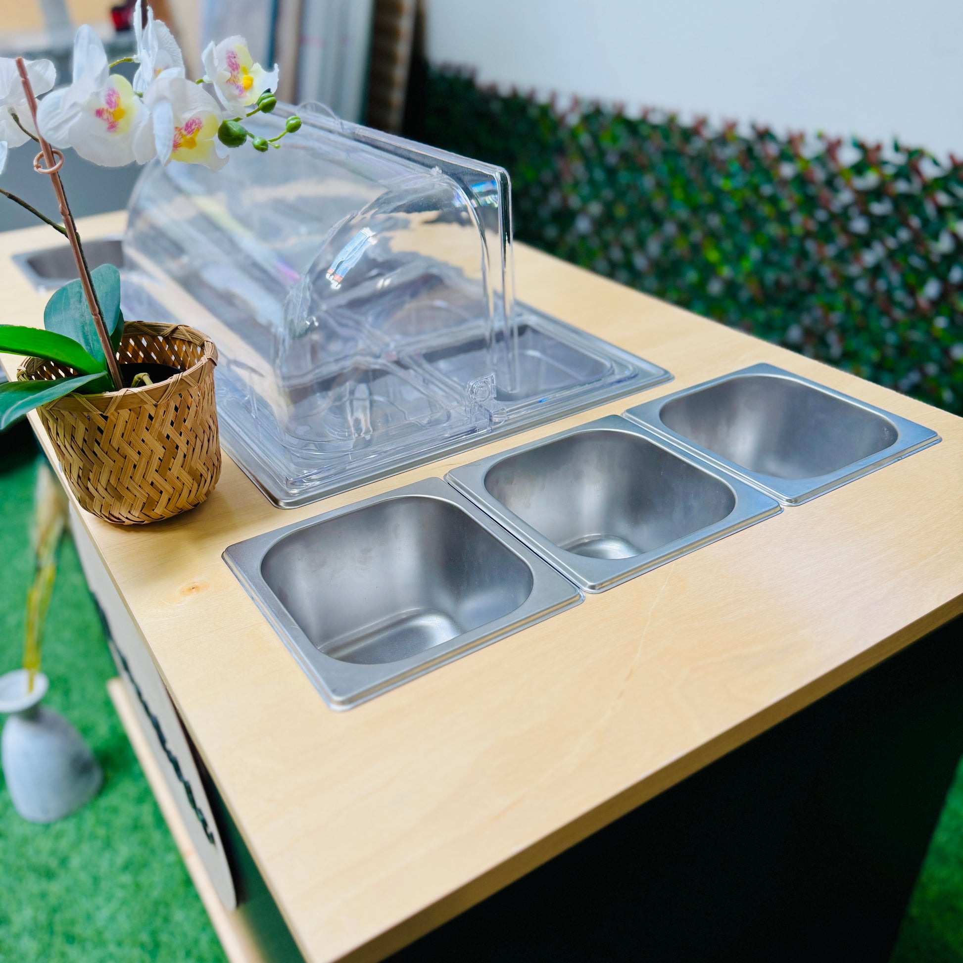 Optional Accessories: Umbrella, menu sign, wooden sign, tools, and decorative items (available separately).